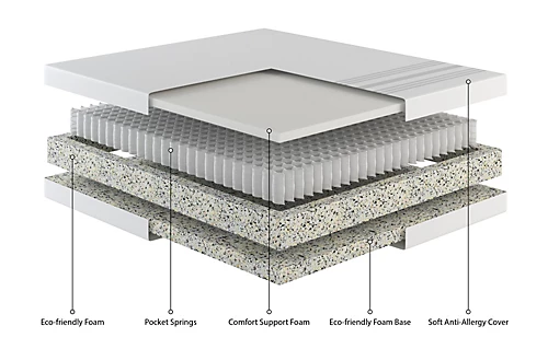 - This eco-friendly, anti-allergy, pocket-sprung mattress has an Eco Foam base & pocket spring encapsulation made from 100% recycled materials. Comes with a soft non-quilted, anti-allergy, breathable cover. ‘Medium’ rating 6/10. No need to turn.