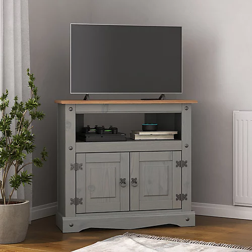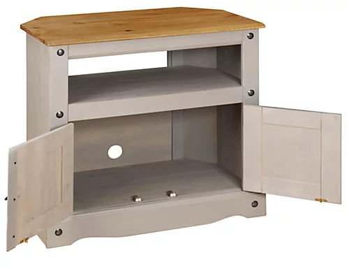 Carrying the trademark Corona Pine features, this Mexican-inspired Corona grey corner TV unit will save you space and will store all your TV and DVD equipment neatly. It will bring a sense of traditional, country style to your living room while happily storing your TV and DVD player. Featuring a cupboard section to store your DVDs. Designed with a space saving, practical shape, this corner TV unit will fit neatly in the corner of a room. The ornate handles and hinges gives this beautiful grey TV Stand a classic country look.