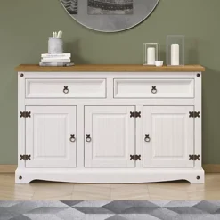 Our most popular sized sideboard, with 2 wide drawers and 3 cupboard doors behind which you will find an adjustable shelf, ample storage all in a beautiful white wax with antique wax finish top.