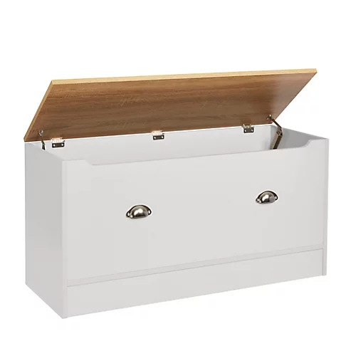 This cream and wood storage box is ideal for space-saving storage in your home, adding a fresh yet modern sense to your interior decor. It has an oak-effect hinged lid and two brass half-moon handles on the front for easy movement around your home. Ideal for storing blankets, shoes, toys, and other items in order to keep your room looking tidy. The contemporary layout provides multiple storage options around the home.