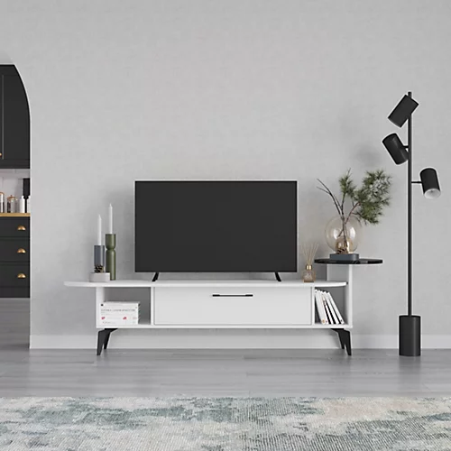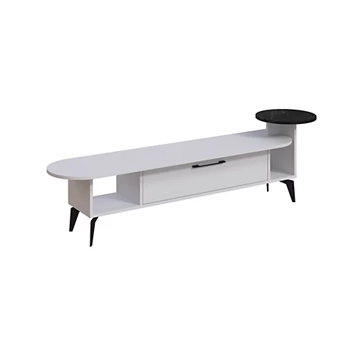This modern TV stand fits up to 65″ TVs and offers ample storage with 2 open compartments and a closed compartment. Its unique design features stylish metal legs and oval parts, and multiple color options are available to fit any interior style.