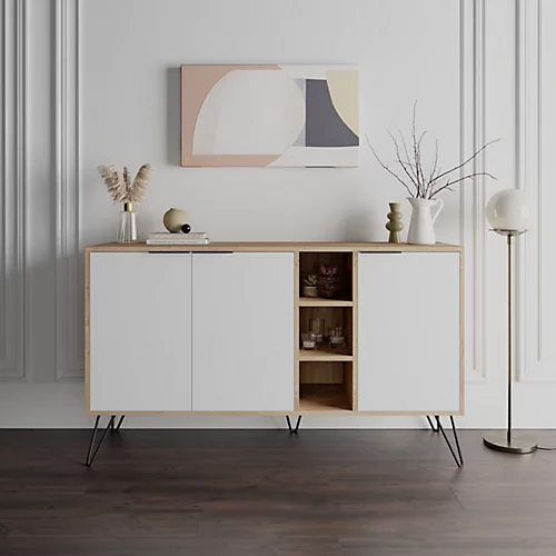 This unique and stylish cabinet is a perfect addition to any home. It provides ample storage space, with an interior shelf in each cabinet. The sturdy hairpin metal legs ensure stability and durability, while multiple color options allow you to match your decor. Elevate your home with this beautiful piece.