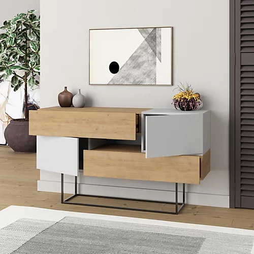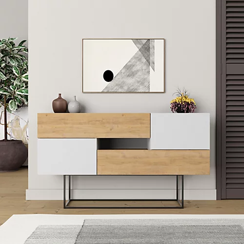 Introducing a stunning sideboard that is sure to upgrade your home decor. The sideboard features 2 cabinets, 2 drawers, and 1 open compartment, providing ample storage space for your belongings. The sturdy metal legs provide a durable piece that will last for years. You can select one of many color options that best match your personal style.