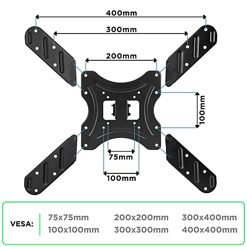 - VERSATILE VESA BRACKET: This television bracket is compatible with TVs that have VESA 50×50, 75×75, 100×100, 200×200, 300×300, 300×400 or 400x400mm mounting holes. It’s easy to check if your TV is compatible; simply measure the horizontal distance in mm between the holes at the back of your TV. If they are the same as the measurements above, it means your TV will fit.