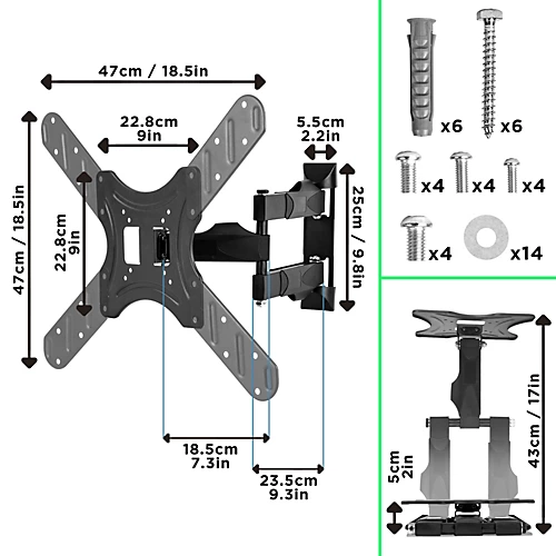 - ADJUSTABLE CANTILEVER DESIGN: The TVB420 has an extendable folding arm which can either hold the screen flat against the wall or extend it away from the wall up to 42cm. The arm can swivel 180° in two places and 360° on the middle joint providing you with a high range of adjustability so you can have you screen positioned just how you like it.