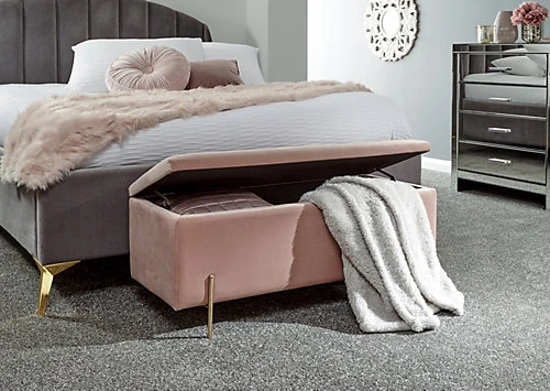 Every bedroom needs a storage box and Mystica is the perfect choice. The simple design makes it a good match for most interiors – pick from a selection of in-vogue colourways to suit your style. The ottoman has a hinged lid and features a generous lined compartment that’s ideal for extra bedding and cushions. Both frame and seat are upholstered in a tactile plush fabric with a matt velvet pile that looks and feels indulgent. The simple gold-effect metal legs add to the minimalist look and feel.