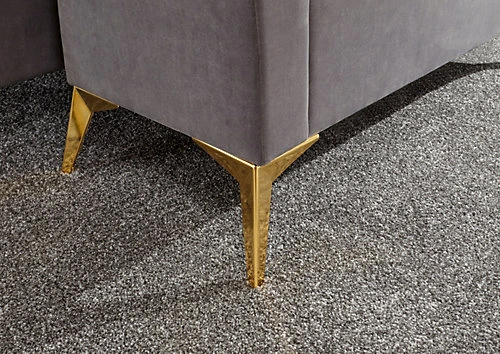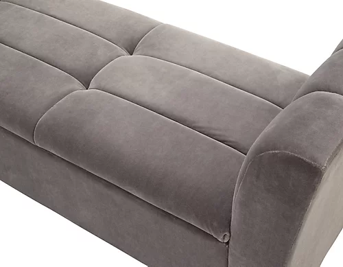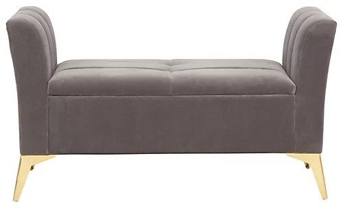 Give an underused window bay β or other bedroom nook β an eye-catching feature with this gloriously elegant window seat. The gently flared arms feature a classic sculpted design and flank a comfortable seat beneath which is concealed a useful lined storage compartment β perfect for blankets and throws. The deep padded frame and seat is upholstered in a tactile plush fabric with a matt velvet pile that looks and feels wonderfully indulgent. The angled gold-effect metal legs add a contemporary contrast to the seatβs classic lines. Pick from blush pink and soft grey colourways.