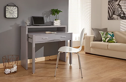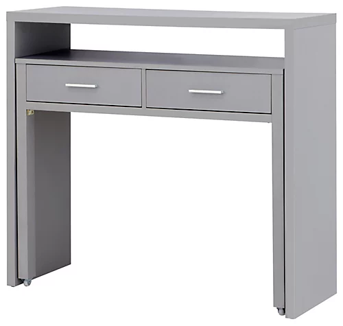 Extremely practical where space is limited, the Regis console desk doubles in depth, thanks to a retractable shelf on wheels, set at the perfect height for a computer keyboard. Two drawers slide out from the unit to help keep all your pens and pencils tidy!