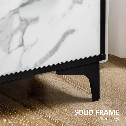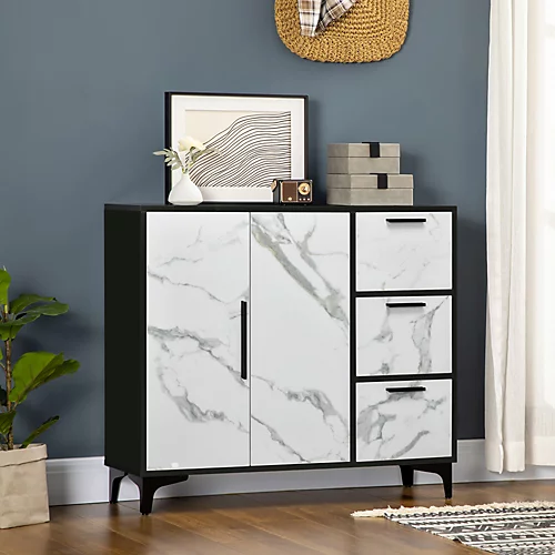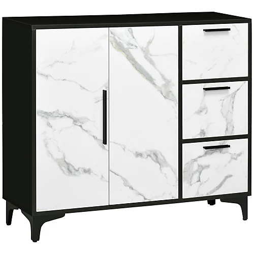 A contrasting look, with a touch of elegance: this HOMCOM freestanding cabinet. Made from MDF, this piece is durable, with metal legs to support the upper body. It comes with a large main cupboard and three drawers for plenty of storage room. The marble effect on the doors look beautiful, contrasting with the black structure for added impact. Complete with steel legs for support.