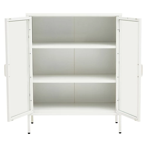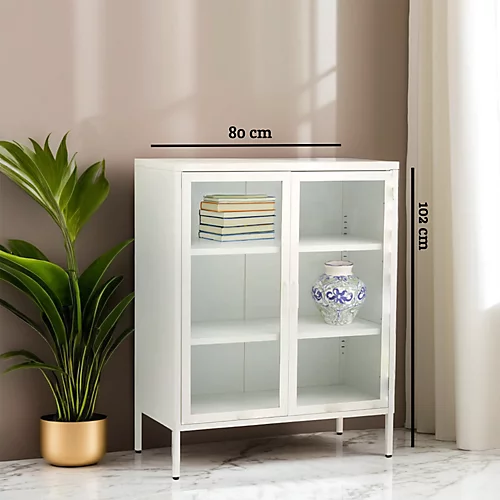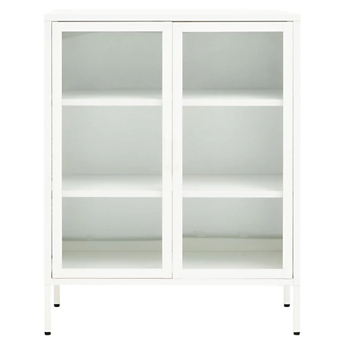 Featuring an elegant and classic design, this cabinet ensures lasting use with sturdy metal construction in white powder coating. Two glass doors with metal handles reveal adjustable inner shelves, providing ample space for compact storage.