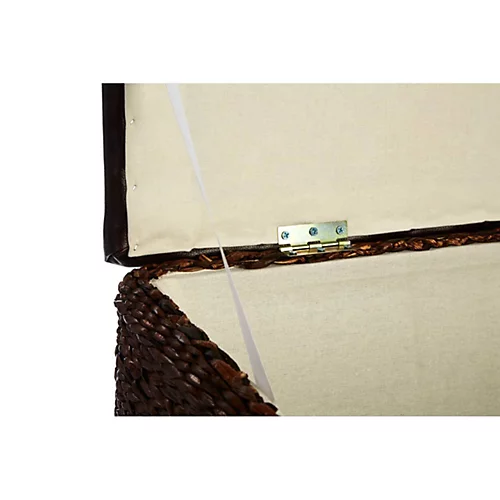 Each ottoman features a hinged lid covered in soft brown faux leather. Dark mottling on its surface complements the rich tones of the cattail. Its tightly latticed weave enhances the durability of this resilient natural material, with the large ottoman supported by stout feet. A great way to discretely store bedding or clothing.