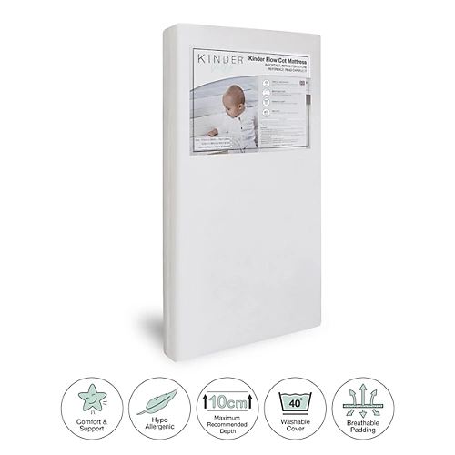 This Kinder Flow Compact Cot Mattress contains a specific nursery grade, high-density, poly-fibre insert, which provides posture support and comfort. It’s suitable for newborns and toddlers and is surrounded by a breathable yet water resistant hypoallergenic cover. The high density polyester pad allows heat dissipation from the body to minimise sweating and create a comfortable sleep for your baby and the covers are also removable for washing in case of any accidental spillages. Suitable for Cots 50cm x 100cm.