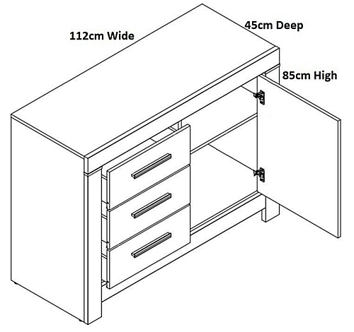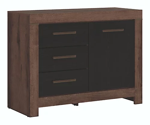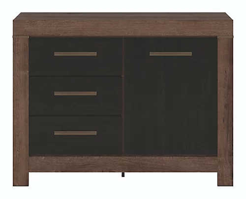 The Balin range offers a Small Sideboard with three drawers and one door in Oak Monastery and Black Oak effect finish, giving the impression of wood with the durability of a laminate. The Small sideboard has three practical drawers on one side and a door on the other with a shelf behind, plenty of space for storing anything; shoes, books, clothing, dinnerware or toys!