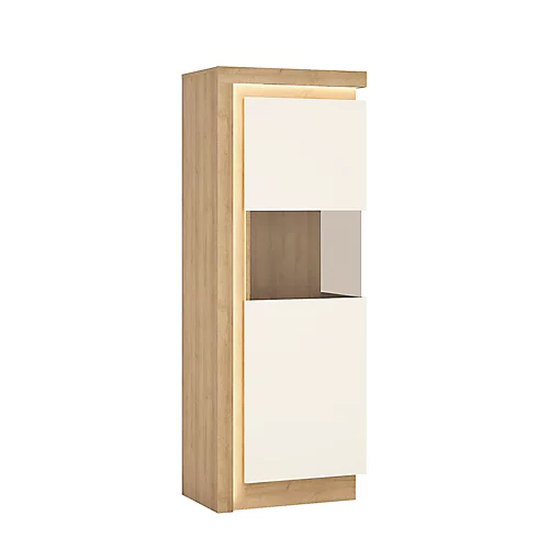 Narrow display cabinet (RHD) 164,1cm high (including LED lighting) in Riviera Oak/White High Gloss. Space saving narrow 164cm high display cabinet (right hand door opening) has smoky glazed area to display family treasures. Includes concealed lighting arrangement. A high quality collection in a ultra modern design – with each item complementing each other.