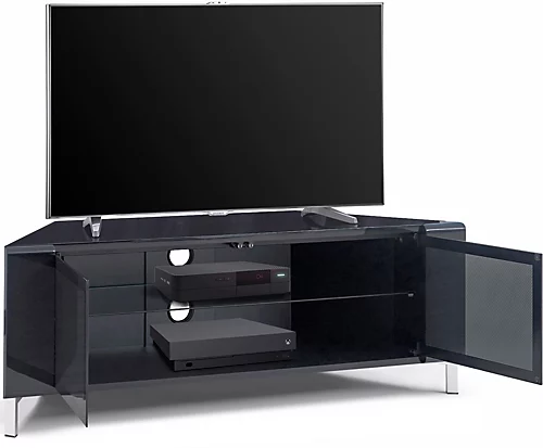 Suitable for all LED, LCD, and OLED flat screen TVs from 26″ to 50″, the Corvus corner-friendly TV stand has space to accommodate most home cinema systems, blu-ray player, Sky/Virgin/BT receivers, amplifiers, digital boxes and games consoles.