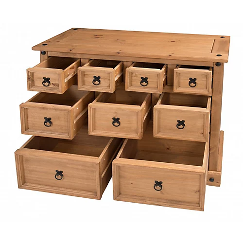 Mercers Furniture is happy to offer this Corona Merchants Chest, the item is expertly crafted from solid pine and hand waxed to preserve as well as enhance the grain. It offers outstanding value for money with 9 drawers that would be a welcome addition to any room. It is finished off with black metal fittings which give the item its distinctive Mexican styling and offers that warm rustic country charm. The item has hardboard backs and drawer bases, its delivered flat packed for easy home assembly with step-by-step instructions.
