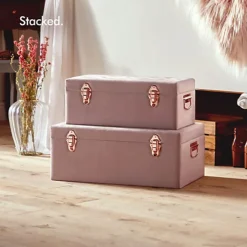 Beautify Storage Trunks – Set Of 2 Pink Velvet Finish Storage Chests W/Rose Gold Detailing, Stackable Organiser W/Lockable Lids