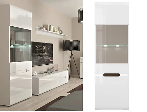 AZTECA T furniture range offers a part glazed single door Display cabinet with glass shelves inside and LED display lighting included. Unit comes with White Gloss front, White Matt Body and choice of Wenge, White Gloss and Black Gloss Inserts.