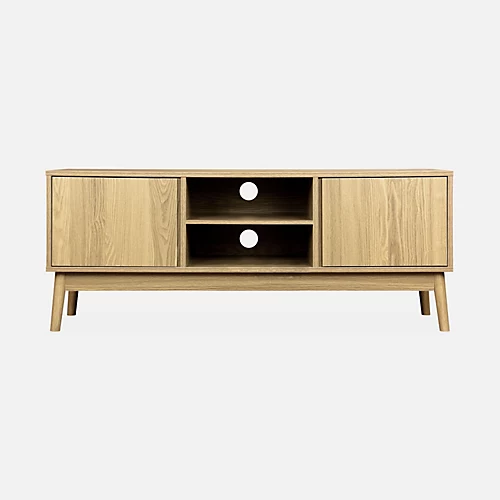 Our Dune collection has a trendy Scandinavian style. The pieces have a natural wood colour which will bring a touch of nature to your home. With the angled compass legs and clean lines the Dune bedside tables chests of drawers TV stands and sideboards will allow you to elegantly furnish your home. The wooden structure and Scandinavian style base of the Dune TV stand give it a retro look that will look great in your home. Its clean minimalist lines will perfectly complement any interior.With its 2 shelves and 2 storage nooks this TV stand offers plenty of storage space that you can use to store your tech accessories. The back of the unit is equipped with two openings which are particularly useful for discreet cable management.TV stand dimensions L120 x W39 x H48cmLeg dimensions 3.8×3.8 /3×3 x H18cmShelf size L37.9 x W38.5cmMax. supported weight 30kgWeight 20.7kg