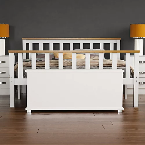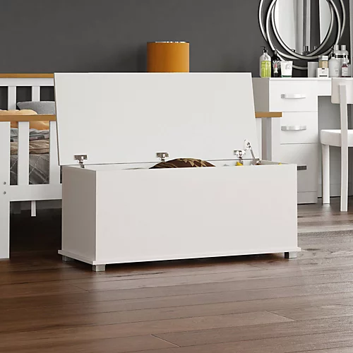 The Leon Storage Ottoman in white is a stylish and practical furniture piece designed to enhance your home decor while providing versatile storage solutions. Lift the hinged top to reveal a spacious compartment where you can conveniently store various items, such as blankets, pillows, books, toys, or any other household essentials. This makes it an ideal choice for those who value both style and functionality. The Leon Storage Ottoman is designed with a clean white finish, adding a touch of elegance to your space. The smooth surface of the MDF gives it a sleek and modern appearance that complements a range of interior aesthetics. One of the key features of this ottoman is its versatility. It can be used in multiple rooms, including the living room, bedroom, or hallway. In the living room, it can serve as a centrepiece or additional seating during gatherings. In the bedroom, it can function as a stylish storage solution for extra linens or seasonal clothing. In the hallway, it can be a convenient spot for putting on or taking off shoes. Overall, the Leon Storage Ottoman in white offers a combination of functionality, style, and versatility. Its sleek design and generous storage capacity make it a valuable addition to any living space, providing a practical solution for organizing and decluttering while enhancing the overall aesthetic of your home.