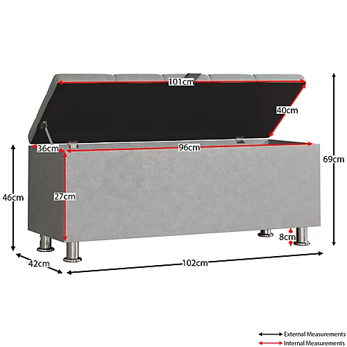 Introducing a storage ottoman that combines sleek and stylish design, elevating the elegance of any room. It is equipped with a spacious storage compartment, offering ample room to store blankets, pillows, books, or toys. The light grey velvet colour enhances its luxurious appeal. With approximate dimensions of H 46 x W 102 x D 42 Cm, it fits seamlessly into various spaces. This storage ottoman is the perfect choice for individuals seeking to enhance both style and functionality in their living room, bedroom, or any other area of their home.