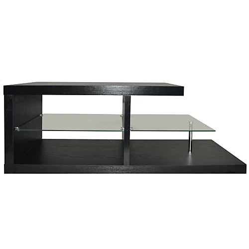 A stunning black widescreen TV display unit. Made from chunky 50mm hollowboard with a black wood effect finish and 8mm clear tempered safety glass. This unit has all the space you need to keep your living room electricals tidy and looking great. Can be used either way around as is finished perfectly on both sides – and is therefore ideal for use as a coffee table too. Dimensions of top: 79.5 x 40cm / maximum weight of TV 40kg / shelves 14.5cm high – enclosed width 48.3cm. Display items not included.