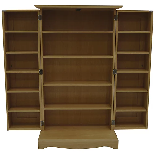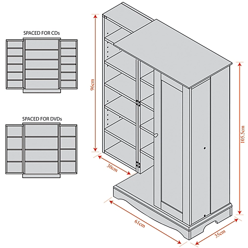 Store up to 495 CDs or 210 DVDs / Blu-rays / computer games or a combination of CDs, DVDs, Blu-rays, computer games and videos in this smart free standing oak effect swing-door cabinet. The doors rotate through 180 degrees to create double-depth storage in a footprint of only 61 x 35cm, and the shelves are adjustable to accommodate DVDs, Blu-rays, computer games and videos. You would need to allow 30cms either side for opening. Made from particle board with an oak wood effect PVC foil. Shelf depth doors: 10cm / Shelf depth cabinet: 13.5 cm. Display items not included. PRODUCT IMPROVED IN 2016