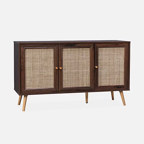 Wooden legsScandi style compass legs3 door sideboardOur Bohemian collection has been designed to bring a natural vintage feel to your home with rattan furniture. The character of the wood finish blends perfectly with the simplicity of the rattan which adds a touch of elegance to the furniture. Coffee table TV stand bedside table… This collection offers you a selection of storage furniture to decorate your home with an air of lightness.Introduce a little bohemian spirit to your home decor with this charming bohemian sideboard. It will look great in your home or office! Its Scandi style compass legs add a retro look that will quickly become the new centrepiece of whichever room you place it in.Not only stylish but this 3 door sideboard also offers plenty of storage space perfect for your living room or dining room. Inside the 2 shelves allow you to optimise the storage and organise your dishes glasses table linen and more. Its 5 legs (including a central reinforcing leg) give it strength and stability.Panels: Laminated panelsDoors: Cane rattan detail2 shelvesNumber of legs: 5 with a central reinforcement legPanel thickness: 1.5cmWeight: 25.4kgMaximum weight supported: 50kgLeg height: 16cm dimensions: L120 x W39 x H70cmStorage space: L76.5 x W37 x H24cm / L76.5 x W37 x H24.5cm / L37.7 x W37 x H24cm / L37.7 x W37 x H24.5cmShelves: L76.5 x W37cm / L37.7 x W37cmDoors: L38.4 x H49cm